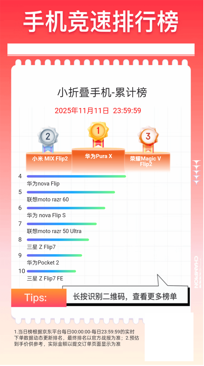 在京东11.11小折叠屏手机累计榜中,华为Pura X、小米MIX Flip2、荣耀Magic V Flip2位列前三。值得存眷的是,在小折叠屏前十中,华为品牌手机占据四个位置;联思moto razr 50 Ultra和联思moto razr 60也插足小折叠屏手机累计榜前十。