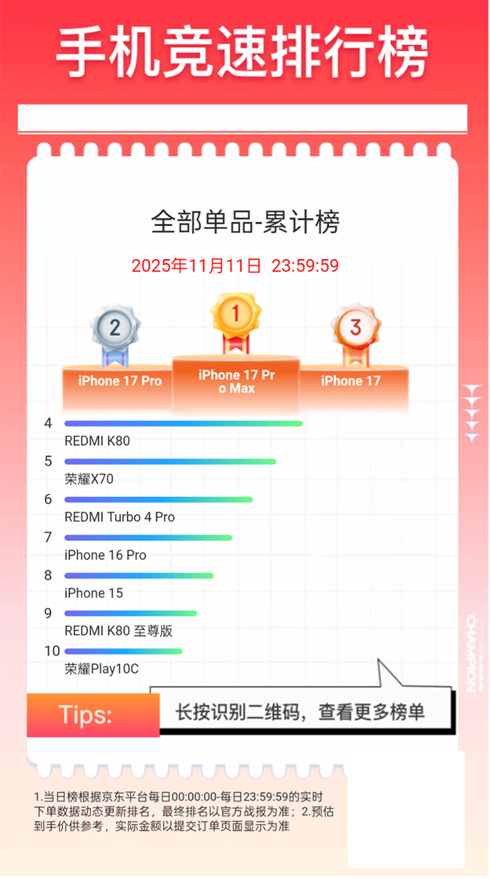 在京东11.11通盘单品累计榜中,iPhone 17 Pro Max、iPhone 17 Pro与iPhone 17包揽前三,iPhone 16 Pro、iPhone 15也插足前十,iPhone竞争力仍旧在线。REDMI推崇亮眼,REDMI K80、REDMI Turbo 4 Pro、REDMI K80至尊版三款机型上榜,插足通盘单品累计榜前十。