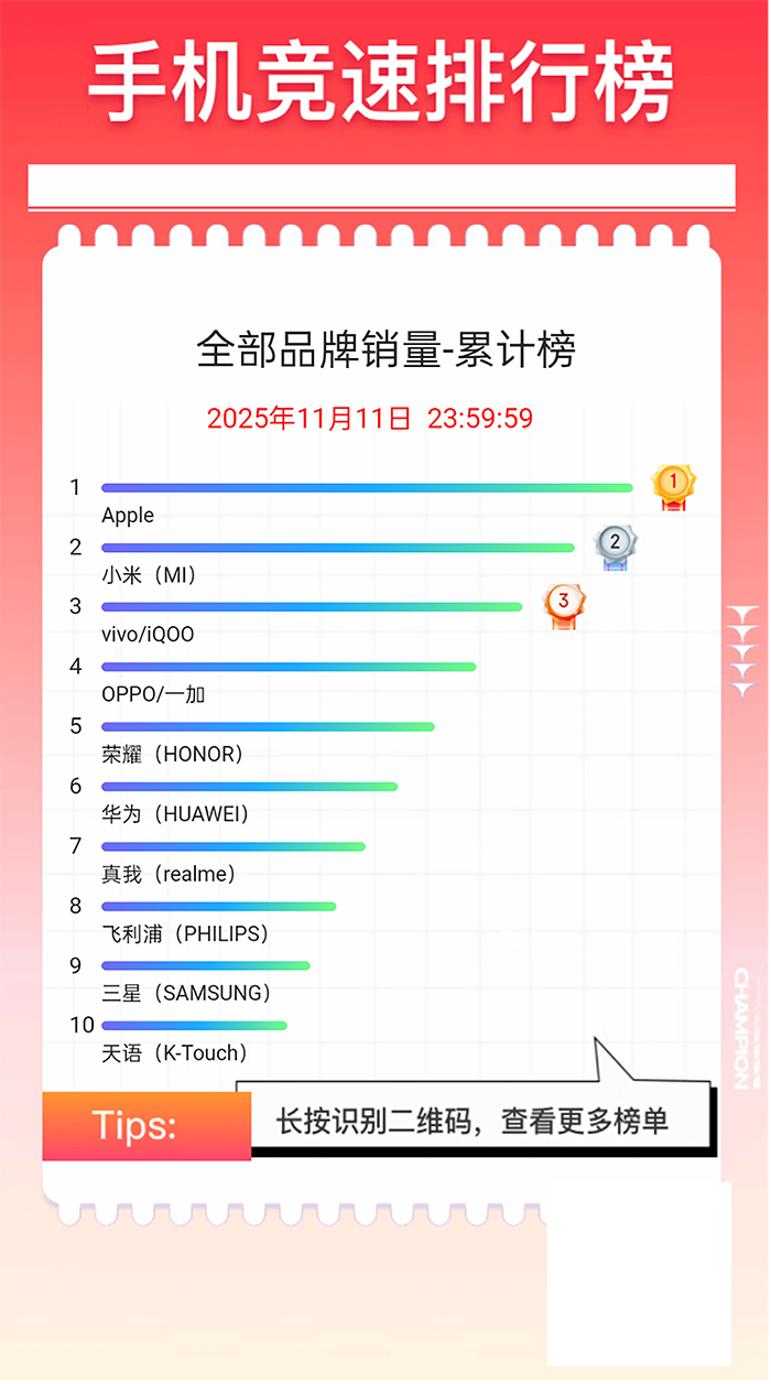 京东11.11圆满收官,繁多耗尽者享受到了“又好又低廉”的商品和职业,手机居品销量增长显耀。京东数据清楚,成交额破亿的手机单品超60款;手机新品成交额同比增长超4倍。京东11.11推动手机竞速榜,左证手机居品销量及时更新,各大手机品牌竞争是非。底下来望望通盘京东11.11全周期各大品牌的热销情况吧。